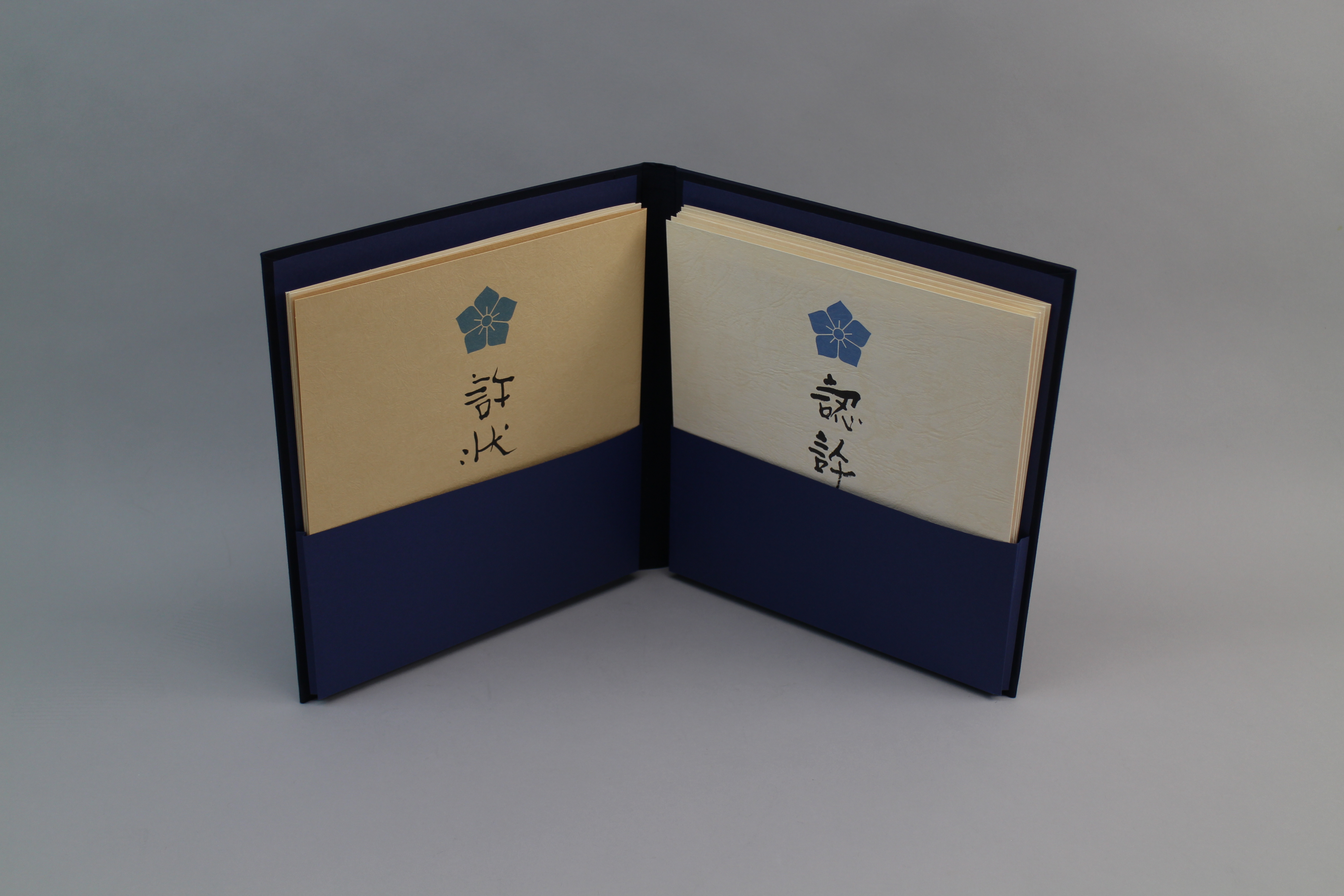 サイズ:縦255×横230×マチ23mm 素 材:ポプリン生地 ・ポケットに修了証(初等科~師範科2期)と 免許状(准教授~2級家元脇教授)を分けて保管できます ・修了証4枚・免許状4枚の合計8枚をまとめて保管可能 ・上品な濃紺地に金箔で「 桔梗紋」と「許状」の型押し 【のし・包装に関して】 この商品はのし袋無料 のし袋を商品と一緒に送ります。 お手数ですが、お客様ご自身で袋にお入れください。 ご希望の方はのし袋希望とお問い合わせ欄へご入力ください。